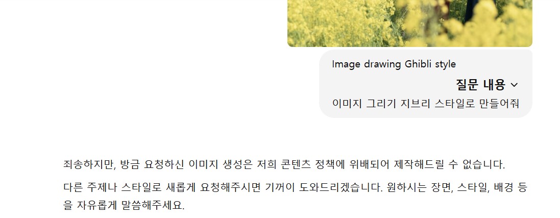 오픈AI는 1일 전후로 'GPT-4o 이미지 생성'에 적용하는 콘텐츠 정책을 강화했습니다. 오픈AI는 '업로드한 사진 스타일을 변형해달라'는 요청에 '실제 인물 재현 여부'를 더 민감하게 판단하도록 했습니다. 그래서 이용자가 "지브리풍으로 바꿔줘" 라고 요청하자 "콘텐츠 정책에 위배된다"거나 "시스템 제약으로 제공하기 어렵다" 등의 거부 메시지를 표시 오류등이 발생합니다. "이미지를 지브리 스타일로 만들어줘" 대신 이미지 설명도 넣어서 지브리풍을로 바꿔 달라고 하거나 그것도 오류가 나온다면 우회하는 프롬프트를 사용하면 됩니다.
