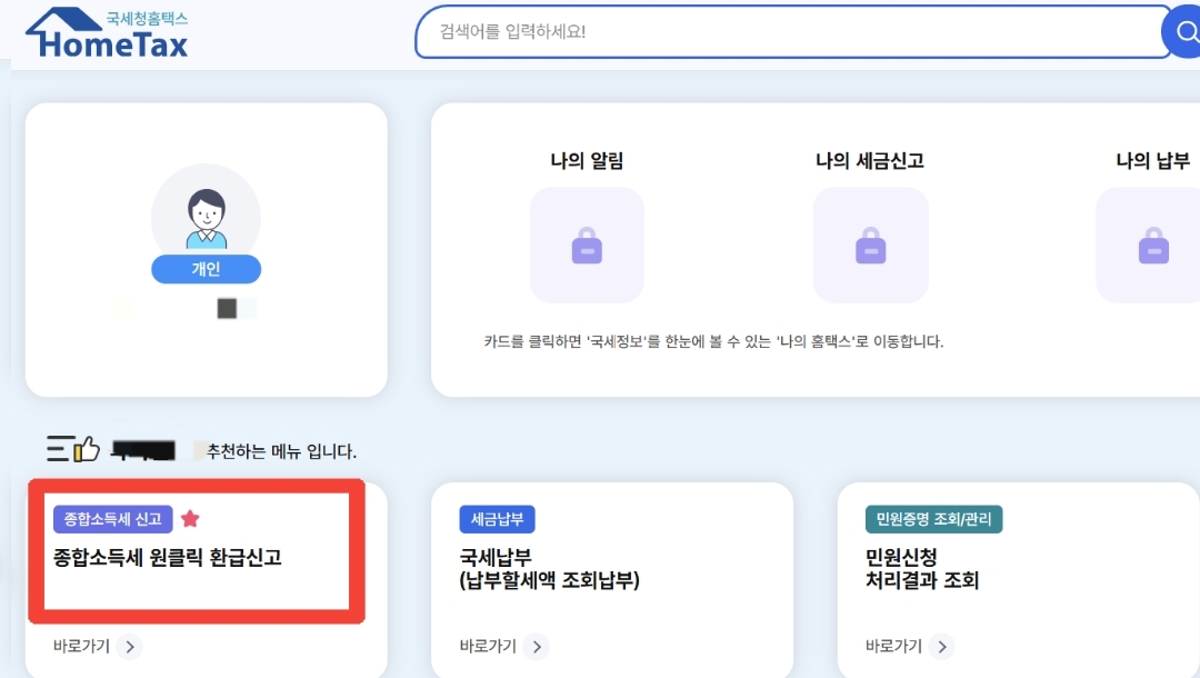 홈택스(PC): 세금신고 > 종합소득세 신고 > 종합소득세 원클릭 환급신고