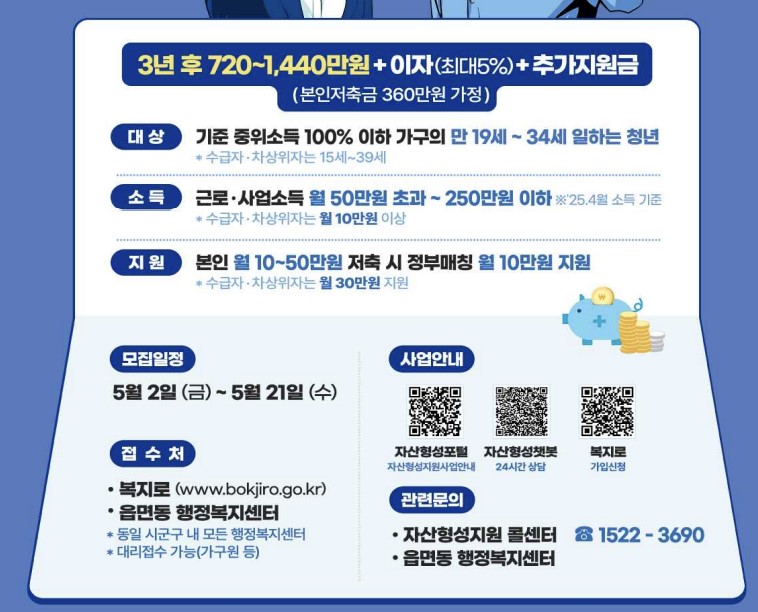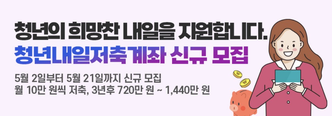 일하는 청년이 매달 10만~50만 원을 저축하면 정부가 월 10만 원(차상위 이하의 경우 30만 원)을 추가 적립해 3년 후 최대 720만~1,440만 원과 최대 연 5%의 이자를 받을 수 있는 제도입니다.